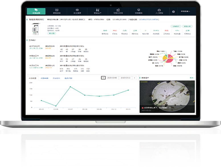 云平臺(tái)或APP上實(shí)時(shí)查看設(shè)備分布點(diǎn)位、工作狀態(tài)、電池電量等,進(jìn)行功能設(shè)置等設(shè)備管理操作;可視化顯示害蟲圖片、種類數(shù)量、變化趨勢(shì),智能分析蟲情報(bào)告,基于農(nóng)業(yè)知識(shí)圖譜推薦蟲害防治方法。