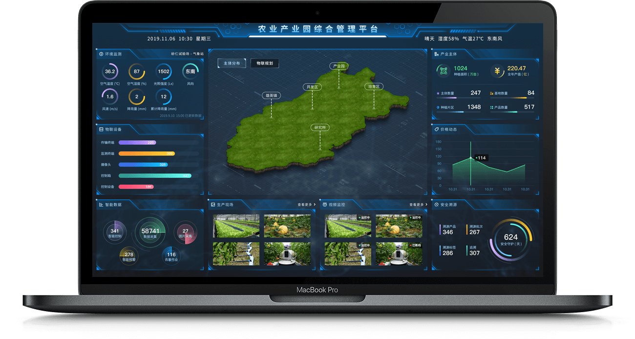 實時監控產業園內的環境監測、監控攝像頭物聯網監測設備的設備信息、設備工作狀態、設備監測數據等,及時預警設備異常和數據異常的情況。