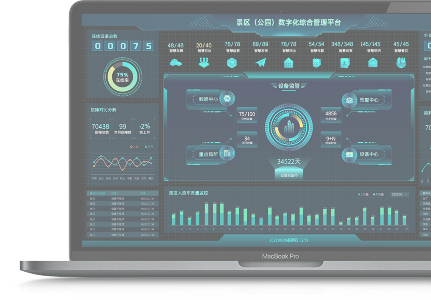 結合景區(公園)氣象、PM2.5、噪音、土壤、水質等環境監測、視頻監控、智能灌溉、人車智能預警管理等,打造數字化的景區(公園)綜合管理平臺。依托綜合管理平臺的應用集成能力,連接景區使用的多個智能化應用系統,以及物聯網感知設備,實時準確獲取環境狀態數據、設備運行數據、能源使用數據,實現人、車、物、環境全聯。對景園多個子系統、設備、人員業務進行全局、集中的統一監測和綜合管理。通過可視化交互降低操作門檻,做到“一屏展現、一鍵管理、集中調度”。同時,在景區的形象宣傳上,加深對景區智能化、數字化特性的線上宣傳。